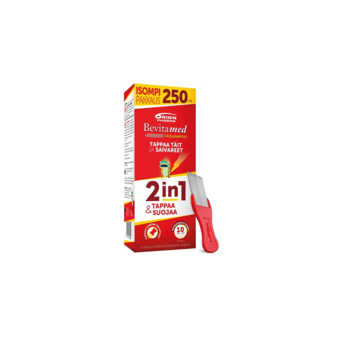 Bevitamed Täishampoo 2in1 tappaa täit ja ennaltäehkäisee uusia tartuntoja. Vaikuttavana aineena on erikoisöljy, joka tukehduttaa ja kuivattaa täit ja saivareet.