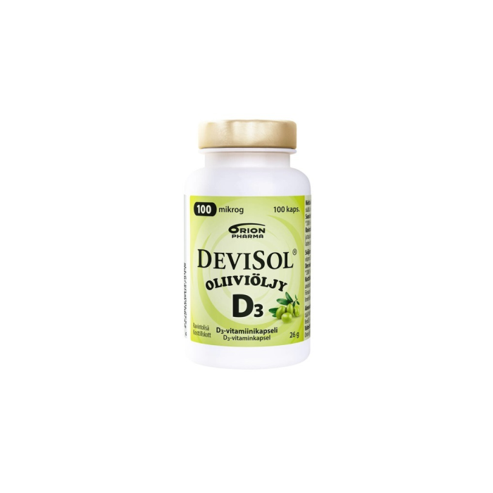 Nieltävä D-vitamiiniöljykapseli. DeviSol Oliiviöljy sisältää hyvin imeytyvää D3-vitamiinia ja korkealaatuista ekstra-neitsytoliiviöljyä samassa, helposti nieltävässä kapselissa. Yksi kapseli sisältää 100 mikrogrammaa D-vitamiinia.