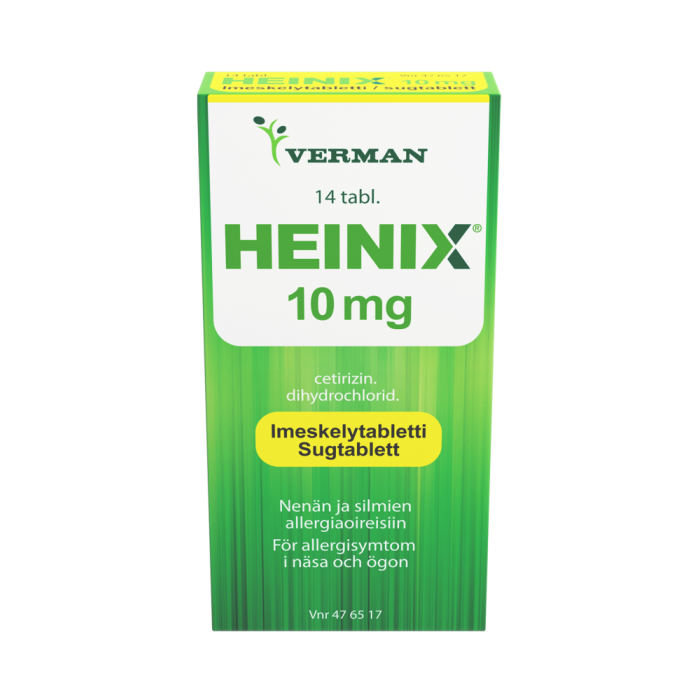 Heinix on allergialääke, jonka vaikuttava aine on setiritsiini. Se on tarkoitettu allergiseen nuhaan liittyvien nenä- ja silmäoireiden hoitoon sekä pitkäaikaisen nokkosihottuman hoitoon. Heinix imeskelytabletti ei sovellu alle 6-vuotiaille lapsille.