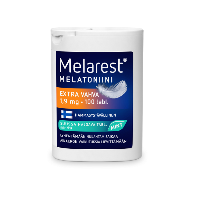 Melarest melatoniinivalmiste lyhentämään nukahtamisaikaa, lievittämään aikaeron vaikutuksia. Melarest Melatoniini Extra Vahva -makutabletit sisältävät 1,9 mg melatoniinia. Hyvänmakuiset, hammasystävälliset suussa hajoavat tabletit on helppo nauttia ilman vettä. Tuote sopii sekä satunnaiseen käyttöön että pidempiaikaiseen käyttöön.