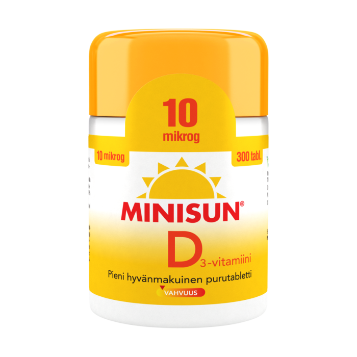 Suomessa kehitetyt Minisun D-vitamiinitabletit sopivat koko perheelle. Minisun 10 mikrog purutabletti sopii käytettäväksi ympäri vuoden.