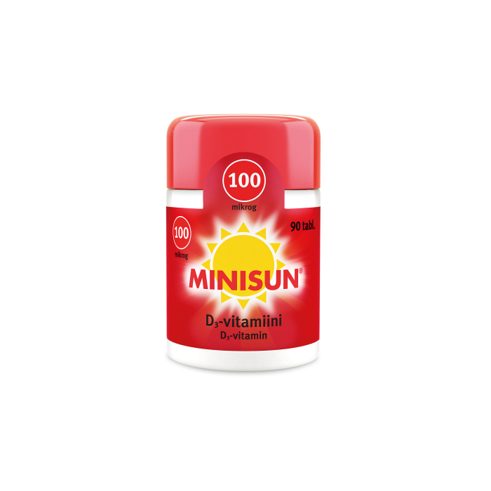 Minisun D-vitaminserien som utvecklats i Finland innehåller ett lämpligt alternativ för var och en. Minisun D-vitamin 100 mikrog är ett starkt vitamin D-preparat som lämpar sig för dagligt bruk eller som kurer – särskilt i fall där kroppens D-vitaminhalt är låg. Välsmakande tuggtabletter med vitamin D3 som effektivt tas upp i kroppen. Vitamin D förstärker motståndskraften och är ett viktigt vitamin för välmående benstomme, muskler och tänder. Minisun 100 mikrogram lämpar sig för ett effektiverat intag av vitamin D hos vuxna och äldre. Tabletterna är sötade med xylitol, och de kan tas både som sug- och tuggtabletter, sväljas hela eller krossas. Produkten innehåller varken laktos, gluten, jäst, soja eller gelatin.