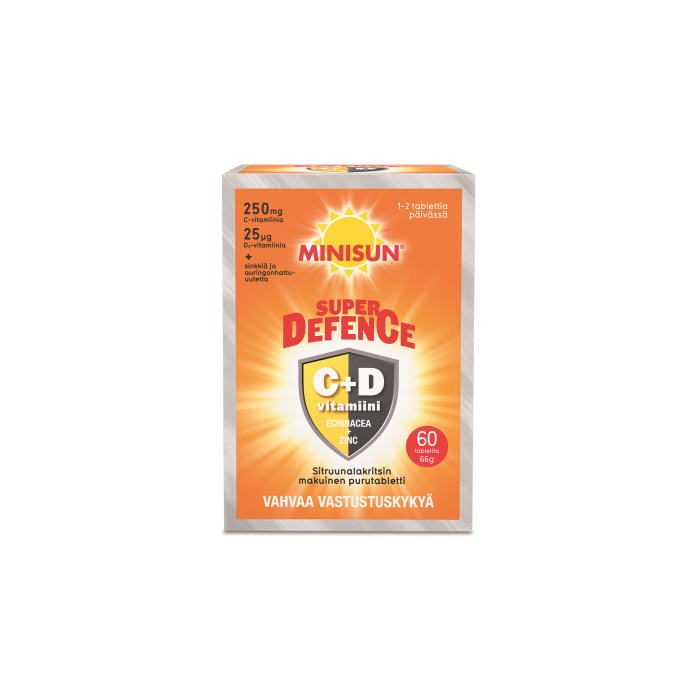 Minisun Super Defence C- ja D3-vitamiineja sekä sinkkiä ja auringonhattu-uutetta sisältävä valmiste.