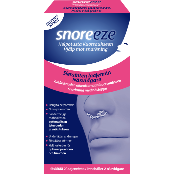 Snoreeze sierainten laajentimessa on kaksi nenän sisäpuolelle asetettavaa, pehmeää silmukkaa. Ne laajentavat sieraimia hellävaraisesti lisäten ilmavirtausta. Tämä saattaa auttaa vähentämään sierainten tukkoisuutta ja siihen liittyvää kuorsausta. Molemmat silmukat voidaan säätää yksilöllisesti, mikä mahdollistaa parhaan mahdollisen mukavuuden ja istuvuuden. Laite pysyy paikallaan koko yön. CE-merkitty lääkinnällinen laite.