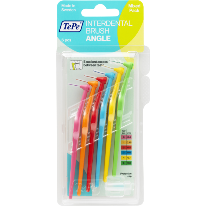 TePe Angle on suunniteltu hallittuun ja helppoon hammasvälien puhdistukseen. Harjan pää on pieni ja taivutettu, jotta se ulottuu helpommin takahampaiden väliin, sekä suulaen että kielen puolelta. Pitkällä, litteällä varrella saa hyvän ergonomisen otteen. TePe Angle on hyvä valinta, jos käsimotoriikka on heikentynyt. TePe Angle löytyy kuudessa värikoodatussa koossa, jotta se sopii kaikkiin hammasväleihin.Värikoodit ovat samat kuin Original-sarjassa. Kaikki koot on varustettu muovipäällysteisellä metallilangalla, joten hammasvälien puhdistaminen on hellävaraista ja turvallista. Etuja: Pieni taivutettu pää optimaaliseen ulottuvuuteen, pitkä, litteä varsi tekee harjasta helpon käsitellä, muovipäällysteinen metallilanka hellävaraiseen puhdistukseen. Mix pack 6kpl.